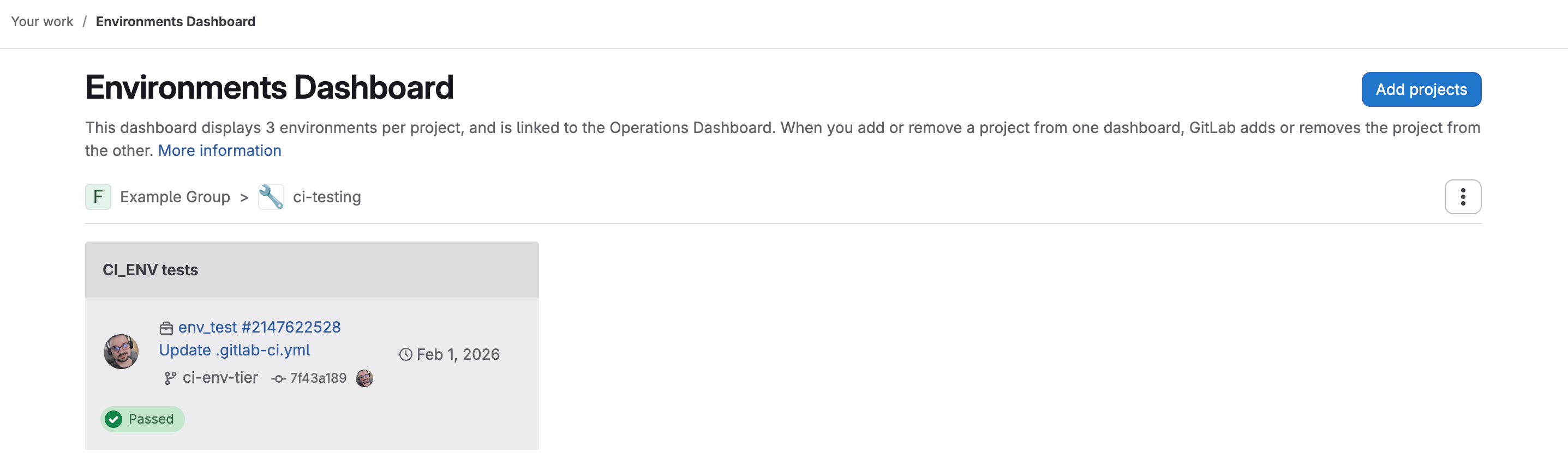 Each project displays its configured environments. Review apps and other grouped environments are not displayed.
