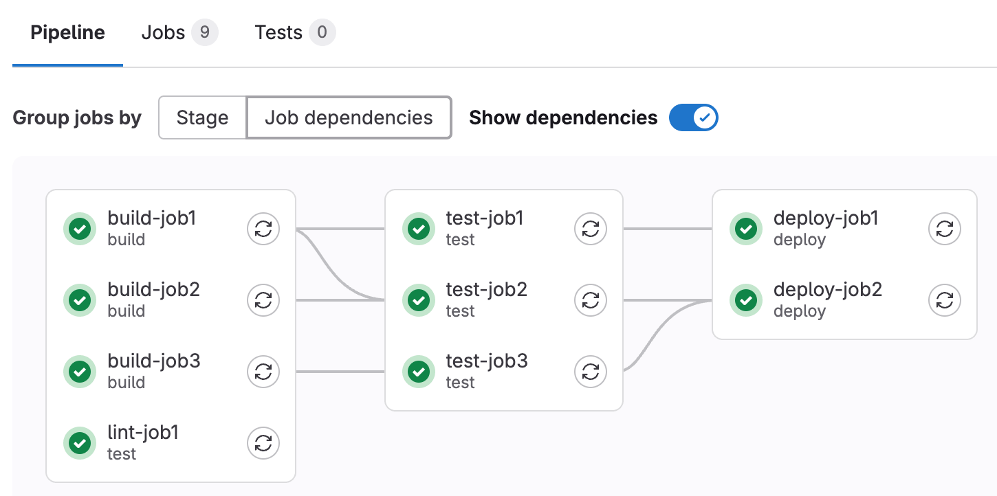 lint-jobis configured withneeds: []and depends on no jobs, so it displays in the first column, despite being in theteststage.test-job1depends onbuild-job1, andtest-job2depends on bothbuild-job1andbuild-job2, so both test jobs display in the second column.- Both