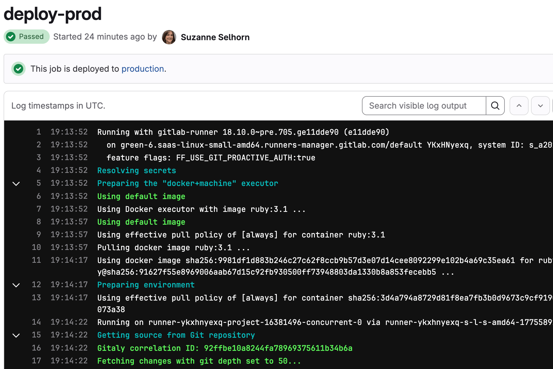 build-job,test-job1,test-job2, anddeploy-prod. The comments listed in theechocommands are displayed in the UI when you view the jobs. The values for the predefined variables$GITLAB_USER_LOGINand$CI_COMMIT_BRANCHare populated when the jobs run. -