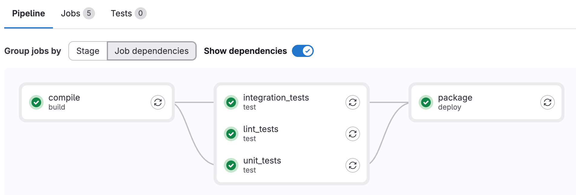You can view the dependencies between jobs on the pipeline graph.