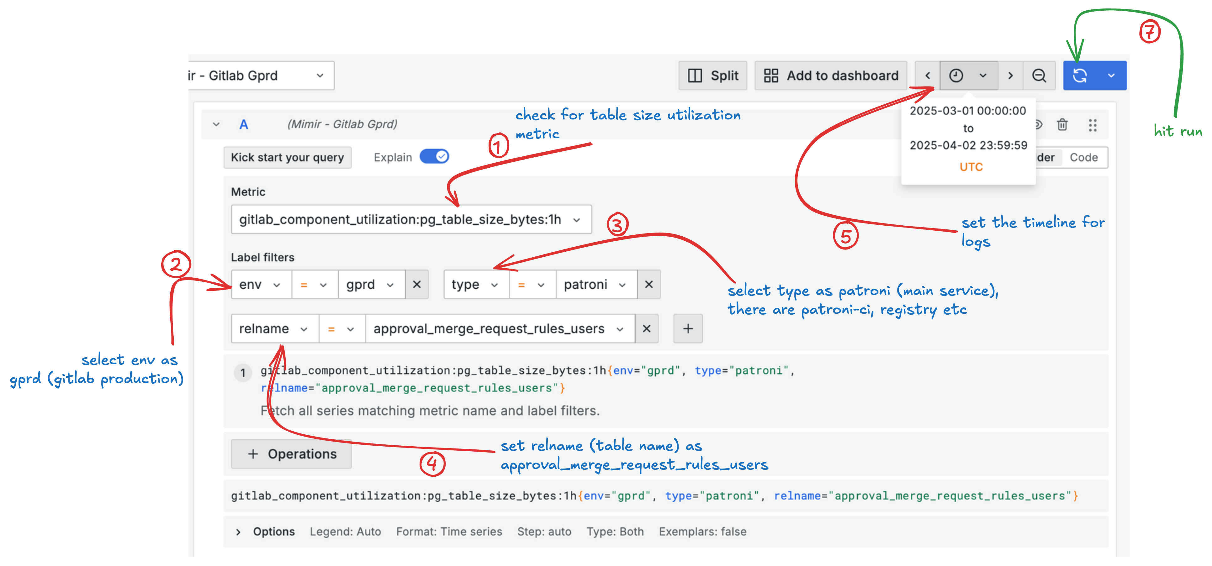 Timeline: select at least a few days prior to the date of job creation. You can see in the MR that failure was reported on 2025-03-31 and the job was created on 2025-03-11. I have selected the time range from 2025-03-01 to 2025-04-02. You can adjust it accordingly.