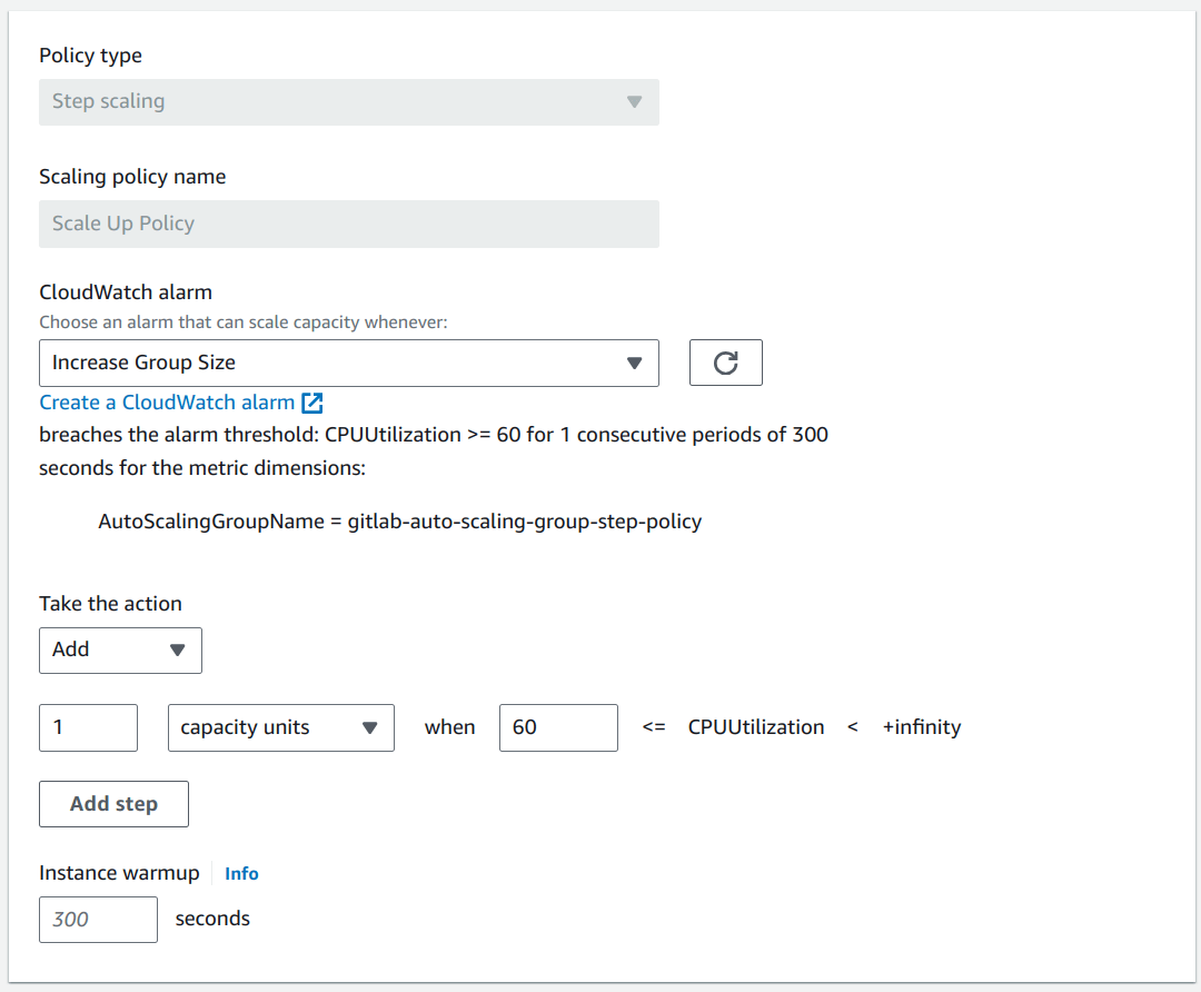 After the auto scaling group is created, we need to create a scale up and down policy in Cloudwatch and assign them.