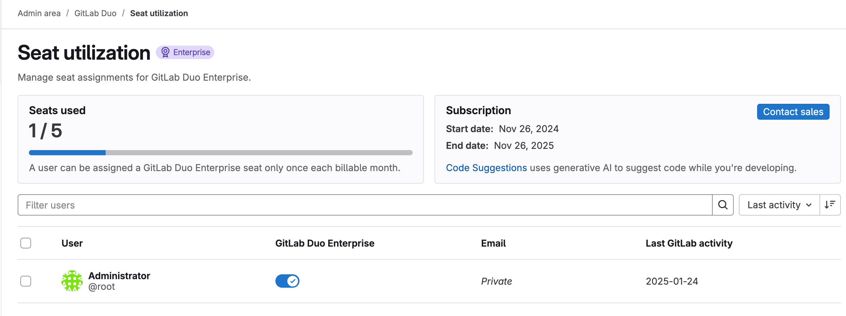 - Toggle the switch in the "GitLab Duo Enterprise" column to enable Duo for the root user