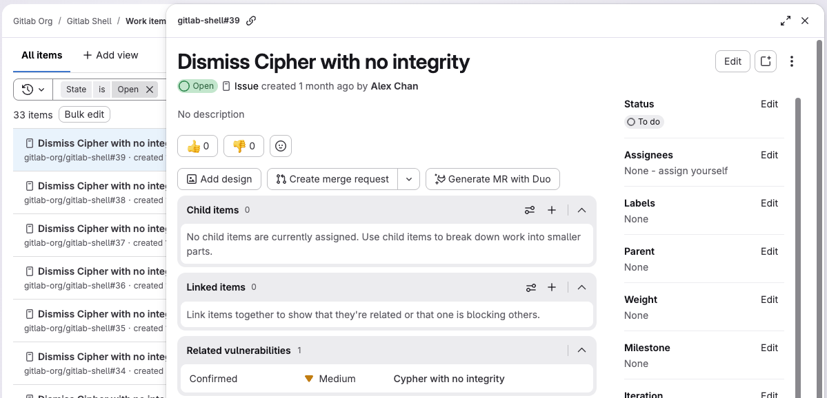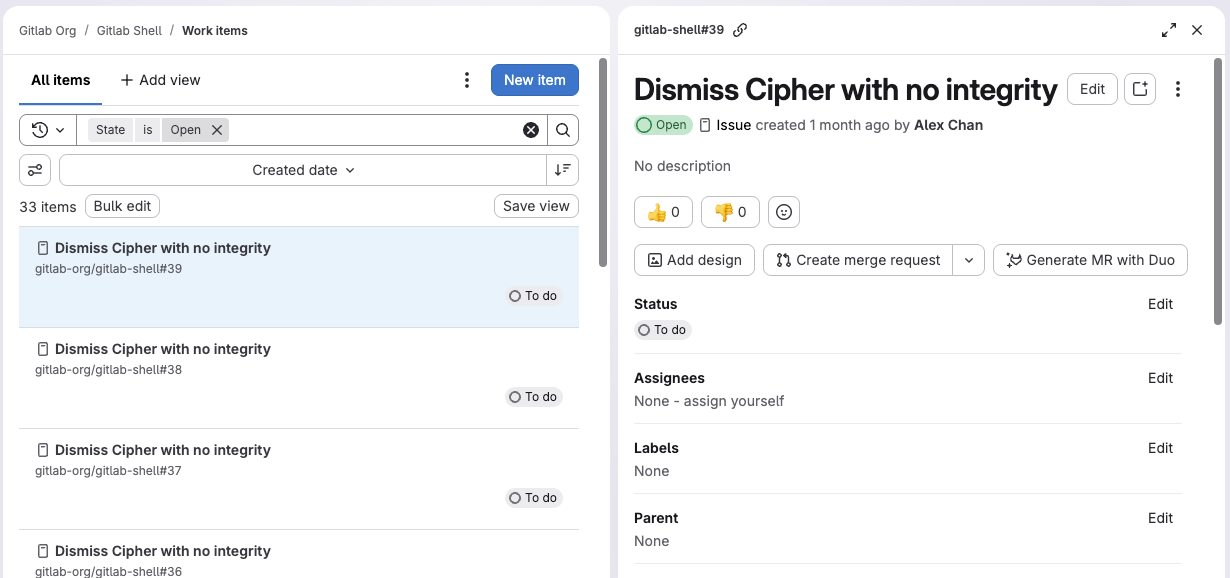 When you select a work item, like an issue, it opens in a details panel.