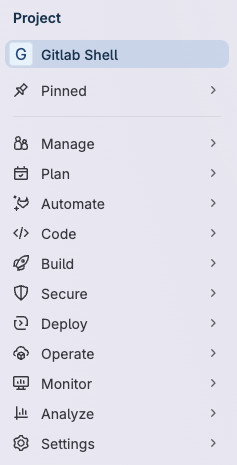 The left sidebar changes based on the information you're viewing. For example, you might be viewing a project, exploring projects or groups, or viewing your profile. To switch to other areas of the left sidebar, use Search or go to in the top bar.