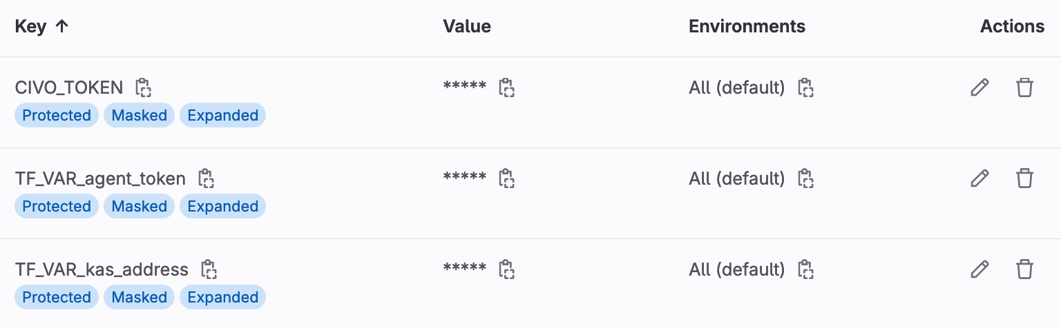 TF_VAR_civo_region: Set your cluster's region.TF_VAR_cluster_name: Set your cluster's name.TF_VAR_cluster_description: Set a description for the cluster. To create a reference to your GitLab project on your Civo cluster detail page, set this value to$CI_PROJECT_URL. This value helps you determine which project was responsible for provisioning the cluster you see on the Civo dashboard.TF_VAR_target_nodes_size: Set the size of the nodes to use for the clusterTF_VAR_num_target_nodes: Set the number of Kubernetes nodes.TF_VAR_agent_version: Set the version of the GitLab agent for Kubernetes.TF_VAR_agent_namespace: Set the Kubernetes namespace for the GitLab agent for Kubernetes.