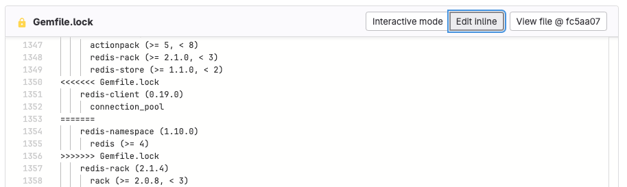 In the header for that file, select Edit inline to open the editor. In this example, the conflict block begins at line 1350 and ends at line 1356: