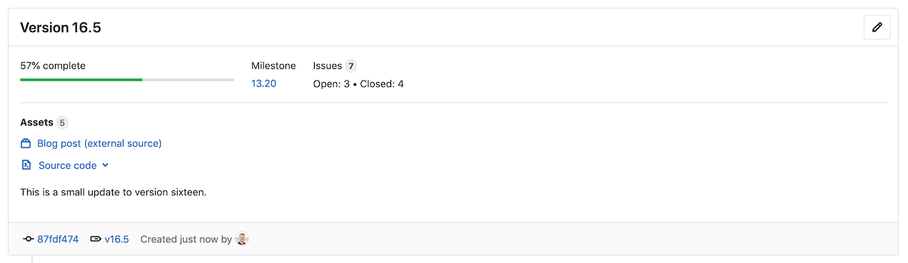 Create a release to package your project at critical milestones. Releases combine code, binaries, documentation, and release notes into a complete snapshot of your project. When a release is created, GitLab automatically tags your code, archives a snapshot, and generates audit-ready evidence. This creates a permanent record that's perfect for compliance requirements and can give your users confidence in your development process.